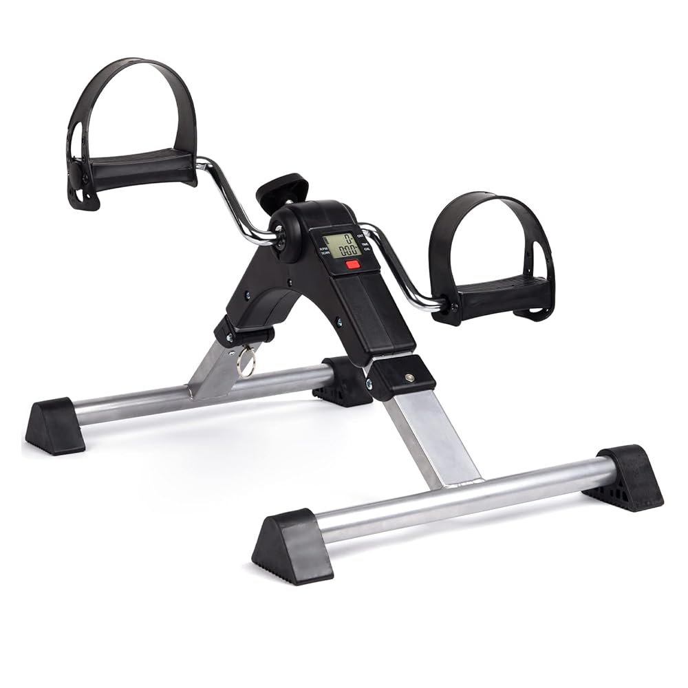 - Under Desk Exercise Equipment for Home Workouts – This compact foot pedal exerciser fits under a table, so you can squeeze in a calorie burn while you do office work or watch TV. Simply fold this leg workout equipment for easy storage when not in use.
