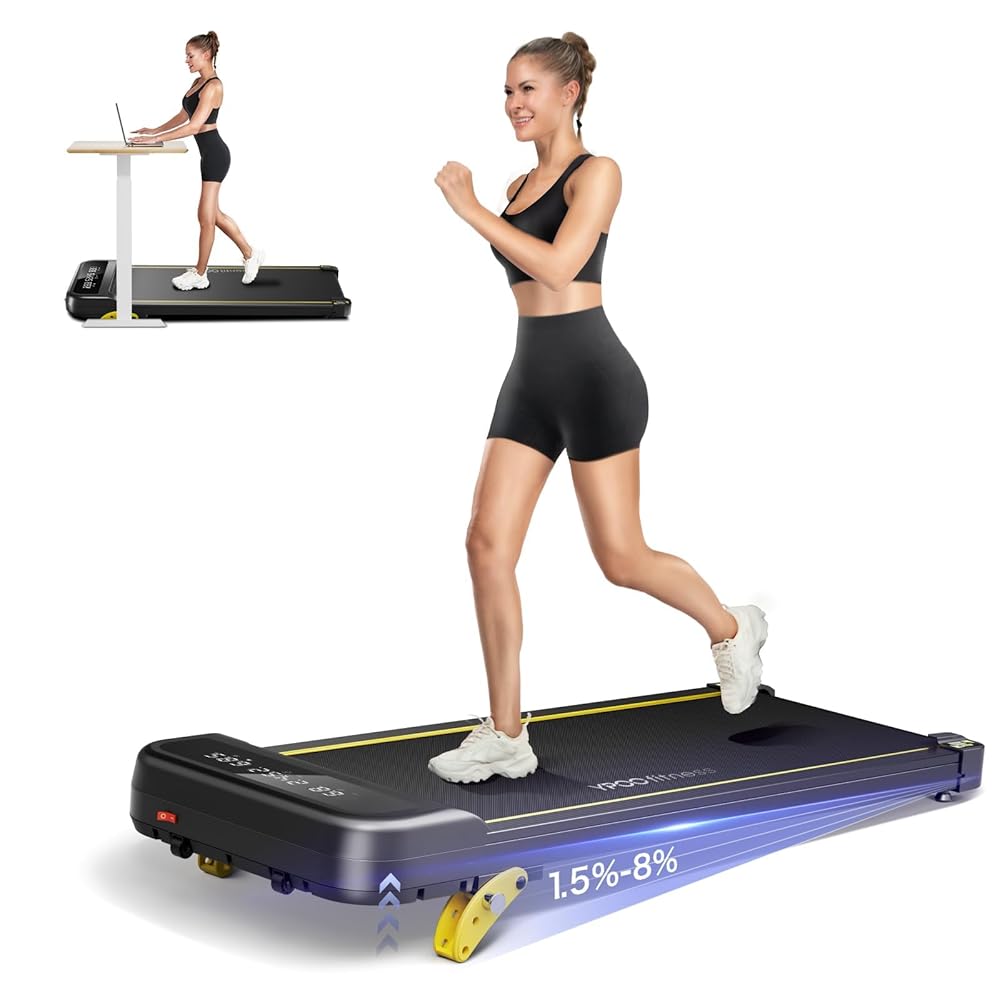 - 【Portable Walking Treadmill With Wheels】The ultra-lightweight 41 lb YPOO walking pad treadmill under desk product comes fully assembled and includes 2 wheels for easy mobility. With a slim height of 4.6 inches, this walking treadmill under desk can be conveniently stored under desk, sofa or bed, or upright against a wall, making it ideal space-saving solution.