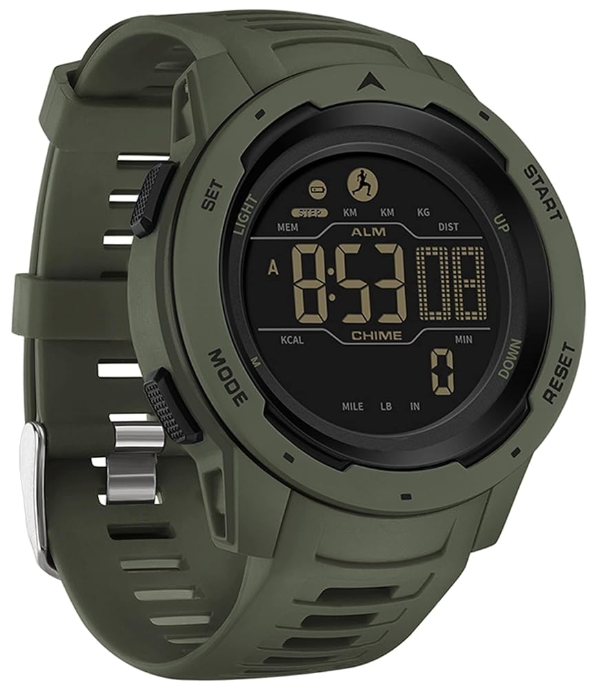- 【Multi-functional Mens Digital Watch】This pedometer watch offers a range of features for tracking your fitness and staying organized. Keep tabs on your calories, steps, and distance with the calorie counter, pedometer, and mileage tracker. Other features include a countdown timer, dual time zone display, alarm clock, stopwatch, hourly chime, LED backlight display, and a calendar that displays the day of the week. The sport watches also supports both 12 and 24-hour time formats.